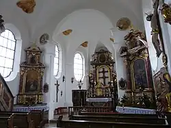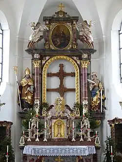 Der Hochaltar besteht aus einem marmorierten Holzaufbau und wurde um 1710 geschaffen. Er wird Ignaz Waibl zugeschrieben. Die leicht geschwungene Mensa und der Drehnischentabernakel, ebenfalls aus marmoriertem Holz, sind jüngeren Datums und stammen von 1770/1780. Auf den Voluten des Drehnischentabernakels befinden sich leuchtertragende Putten. Im Hochaltar befindet sich kein Altarbild. Stattdessen ist das Feldkreuz eingesetzt, welches zur Errichtung der Kapelle den Anlass gab. Das Feldkreuz befindet sich in einem runden Rahmen und ist von Freisäulen flankiert. Rechts und links des Hochaltares befinden sich gefasste Holzfiguren eines Hl. Bischofs und der Hl. Katharina. Im Altarauszug ist ein hochovales Bild mit der Darstellung Gottvaters zu sehen. Geschaffen hat das Bild um 1687 Johann Friedrich Sichelbein. Es ist von Freisäulen flankiert und von verkröpftem Gebälk umgeben.