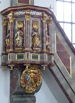 Die Kanzel besteht aus einem marmorierten Holzaufbau und stammt aus der Zeit um 1710. Gefertigt wurde die Kanzel vermutlich von Ignaz Waibl. Unterhalb des polygonalen Korbs befindet sich eine Wappenkartusche der Fugger-Kirchberg-Weißenhorn/Waldburg-Zeil. In den durch Freisäulen gegliederten Feldern befinden sich kleine Figuren der vier Evangelisten. Der Schalldeckel der Kanzel wird von Blattvoluten und Engelsköpfen bekrönt.