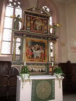 Das den Altar beherrschende große Gemälde zeigt das letzte Abendmahl Jesu mit seinen zwölf Jüngern. An der Vorderseite des Tisches ließ der Maler den Platz frei. In dem freien Raum steht eine Weinkaraffe, welche in einem umlaufenden Band den Namen des Malers trägt. Damit wurde er wie auch die gegenüber sitzende Gemeinde zum Tisch des Herrn eingeladen. Der Jünger, welcher den Betrachter fragend anschaut, hat ein auf Jesus gerichtetes Messer vor sich liegen und einen Beutel in der Hand.