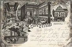 Zumindest in der Zeit zwischen 1803 und 1845 gehörte das Gebäude dann der Familie Nathusius und diente als Tabakfabrik. Etwa ab 1850 gehörte das Haus dem Kaufmann Fr. Overlach. Im Erdgeschoss wurden Umbauten vorgenommen, um Ladengeschäfte unterzubringen.[11] Spätere Eigentümer waren Schollmeyer und Boehme. Sie veranlassten 1882 und um 1890 weitere Umbauten. Das ursprüngliche Portal wurde dabei entfernt. In der mittleren Achse des unteren Giebelgeschosses wurde ein kleiner Erker angefügt, der mit einer geschweiften Haube bedeckt war. Im Erdgeschoss entstand eine Gaststätte. Eigentümer blieb alleine O. Boehme und ab Ende der 1930er Jahre seine Witwe A. Boehme. Im Haus wurde das bekannte Café Peters betrieben.
