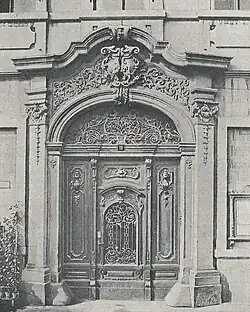 Scheller ließ 1719 durch den Architekten Preusser ein neues dreigeschossiges Gebäude im Stil des Barock errichten, das bis zum Zweiten Weltkrieg bestand und das Erscheinungsbild des Marktplatzes wesentlich mitprägte. Es galt als eines der schönsten Baudenkmäler der Stadt.[3] Die siebenachsige Fassade aus Sandstein[4] war verputzt, die mittleren drei Achsen traten als flacher Mittelrisalit hervor. Die Fensteröffnungen dieses Mittelteils waren durch aufwändig verzierte Verdachungen betont. Oberhalb des Risalits erhob sich ein zweigeschossiges, ebenfalls dreiachsig ausgeführtes Zwerchhaus. Bekrönt wurde das Zwerchhaus von einem gesprengten Segmentbogengiebel, auf dem sich drei Figuren befanden. Die vertikale Gliederung erfolgte mittels Lisenen. Mittig im Erdgeschoss befand sich ein üppig verziertes Korbbogenportal, in dessen Bekrönung sich eine Wappendarstellung befand. Seitlich des Portals befanden sich Pilaster. Zum Anwesen gehörte ein an der Fettehennenstraße befindliches Hinterhaus.
