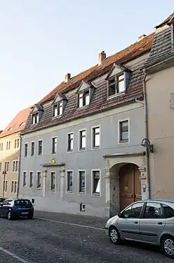 Der ehemalige Gasthof Zum goldenen Löwen steht in der Nebrarer Straße 1 in Querfurt. Das Gebäude wurde bei einem Stadtbrand am 26. August 1678 zerstört. Dabei kam die 15-jährige Anne Regina Lasse im Keller um, wohin sie sich mit einer Magd und zwei Tanten geflüchtet hatte. An dieses Ereignis erinnert heute ihr Grabmal auf dem Friedhof, auch bekannt als Brandjungfer.[2] Das Gebäude verfügte früher über eine Hofeinfahrt und einen Hauseingang von der Straßenseite her. Der Hauseingang wurde bei den Umbauarbeiten im 20. Jahrhundert zum Wohnhaus zugemauert. Heute befindet sich dort ein Fenster. Die Stelle des ehemaligen Hauseinganges ist noch erkennbar, neben dem Fenster befinden sich angedeutet jeweils eine Säule und über dem Fenster befindet sich der namensgebende liegende goldene Löwe.
