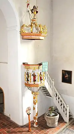 Den Kanzelkorb schmücken Halbreliefs der Evangelisten. Den Schalldeckel ziert eine aufgesetzte goldfarbige Krone, über der sich der auferstandene Christus mit der Siegesfahne erhebt. Die Kanzel ist nicht wie sonst üblich, an der Wand oder einem Pfeiler des Kirchenschiffes hängend angebracht, sondern steht auf einem unter der Kanzel mittig stehenden Pfeiler, den eine rankende Pflanze schmückt. An der Wand unter der Kanzel ist ein altes Apostelkreuz zu sehen, ein zweites Exemplar befindet sich an der nördlichen Wand des Altarraums. Direkt unter der Kanzel steht ein Taufbecken von 1546.
