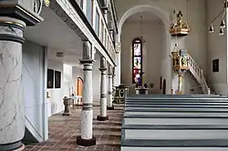 Betritt man die Kirche durch die kleinere der beiden nördlichen Eingangstüren, so beeindruckt zunächst der Blick auf die hohe Kanzel von 1731. Der steile Treppenaufgang wird heute nicht mehr zu jeder Predigt genutzt, sondern nur noch zu besonderen Anlässen. Ursprünglich war die Kanzel zusammen mit der Orgel im (zu) kleinen Altarraum untergebracht, so dass von 1970 bis 1974 ein großer Umbau der Kirche vorgenommen wurde, mit dem Ergebnis des heutigen Standortes von Kanzel und Orgel.