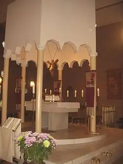 Liturgischer und räumlicher Mittelpunkt der Kirche war der erhöht stehende, von Säulen getragene Altarbaldachin (Ziborium). Unter ihm befanden sich der Altar und der 1958 von Eva Burgeff geschaffene Tabernakel.[2] Zur weiteren Ausstattung der Kirche gehörten ein ebenfalls von Eva Burgeff geschaffener Taufstein mit zwei angeschlossenen Weihwasserbecken, der Kreuzweg von Jochem Pechau und die Orgel der Firma Seifert.