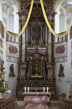 - Der zweigeschossige Hochaltar aus Stuckmarmor wurde von Franz Schmuzer (1676–1741), dem Sohn des Baumeisters, in den Jahren 1718 bis 1721 geschaffen. In einer vergoldeten Muschelnische im unteren Altar wird das Gnadenbild der Schmerzhaften Muttergottes aufbewahrt, eine farbig gefasste, spätgotische Schnitzfigur.