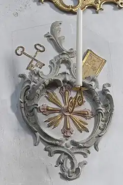 Das große Langhausfresko, auf dem Judith das abgeschlagene Haupt des Holofernes in Händen hält, ist angelehnt an ein Deckengemälde von Matthäus Günther in der Wiltener Basilika in Innsbruck aus dem Jahr 1754/55.