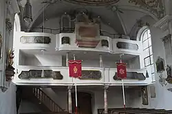 Die Gemälde der Emporenbrüstung wurden in der Mitte des 18. Jahrhunderts ausgeführt. Auf der oberen Empore sind in der Mitte König David mit der Harfe und die heilige Cäcilia an der Orgel zu sehen. Die anderen Szenen zeigen die Auferweckung des Lazarus und die Heilung des blutflüssigen Weibes. Die Szenen auf der unteren Empore stellen das Gastmahl bei Simon dem Pharisäer und Christus bei Maria und Martha dar. Das Mittelbild mit der Abendmahlszene wird um 1787 datiert und Matthäus Günther zugeschrieben.