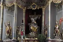 - Die Altäre sind im Stil des Neubarock ausgeführt. Die Mittelnische des Hauptaltars nimmt eine Pietà ein, seitlich stehen zwei Engel sowie die Figuren des Erzengels Michael (links) und des heiligen Florian von Lorch (rechts). An den Seitenaltären sind Figuren aus der Zeit um 1720 aufgestellt, am nördlichen Seitenaltar die heilige Katharina und die heilige Margareta, am südlichen Seitenaltar die heilige Apollonia und die heilige Barbara.