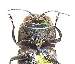 Bild 2: grün: Kinnfortsatz der Vorderbrust orange: Prosternalfortsatz blau: Mittelbrust ocker: Hinterbrust |