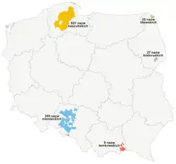 Zweisprachige Ortsnamen wurden inzwischen auch in den kaschubischen Gemeinden Stężyca und Chmielno eingeführt. Erste Ortschaft war dabei Szymbark, auf Kaschubisch lautet der Ortsname „Szimbark“. Die Genehmigungen für diese Gemeinden haben allerdings keinen direkten Bezug zum Minderheitengesetz. Die Kaschuben gelten nämlich weder als eine nationale noch eine ethnische Minderheit. Dafür aber ist ihre Sprache als Regionalsprache anerkannt worden. In ganz Polen werden derzeit 52 Gemeinden den Anforderungen bezüglich zweisprachiger Ortsnamen gerecht, davon liegen 27 in der Woiwodschaft Opole.