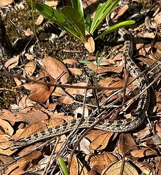 Die Grundfärbung ist aschgrau bis braun oder kastanienbraun; der Rücken zeigt viele ungleichmäßig verteilte, dunkle Flecken, die teilweise annähernd rechteckig, ansonsten in ihrer Form ungleichmäßig sind. Die Fleckung befindet sich zwischen zwei hellen Streifen, die sich vom Nacken bis zum Schwanz über den gesamten Körper ziehen und für die Art namensgebend sind. Auf dem Kopf befindet sich eine V-förmige, dunkle Zeichnung, deren Spitze auf dem Frontalschild liegt, außerdem ziehen dunkle Schläfenbänder vom Auge zum Schnauzenwinkel. Die Bauchseite ist braun bis dunkelbraun gefärbt.