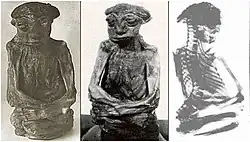 Die Zwergenmumie fand man in sitzender Position (18 cm hoch) mit gekreuzten Armen. Der Schädel war eingeschlagen. Die Mumie von Wyoming wurde von Harry Shapiro mit Hilfe von Röntgenstrahlen untersucht und soll nach seinen Analysen eine Frau gewesen sein, die im Alter von 65 Jahren starb. Die Zwergenmumie von Wyoming wurde von dem amerikanischen Geschäftsmann T. Goodman erworben und nach New York gebracht, wo sie kurz vor seinem Tod gestohlen worden sein soll.